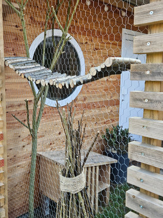 Das Außengehege lädt zum Sonne und Frischluft tanken ein und bietet außerdem die Möglichkeit, die Natur auf dem Grundstück und dem dahinterliegenden Knick zu beobachten.